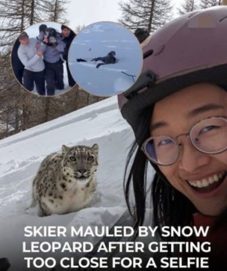 She just thought it could be sweet to take picture with wild snow leopard and then the leopard clawed her face out and bit her skull. the only reason she didnt die was the helmet prevented the leopard from cracking her skull.