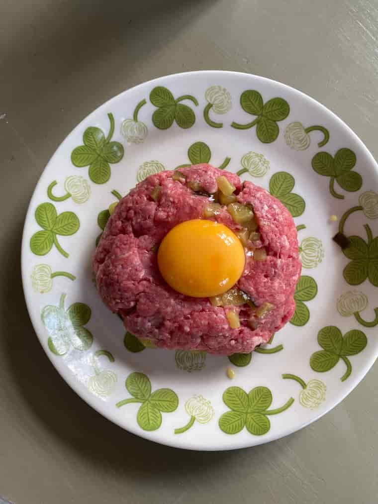 Separate the egg yolk from the egg by putting it into a small dish and using a spoon to lift it. Then place it on top of the beef mixture.