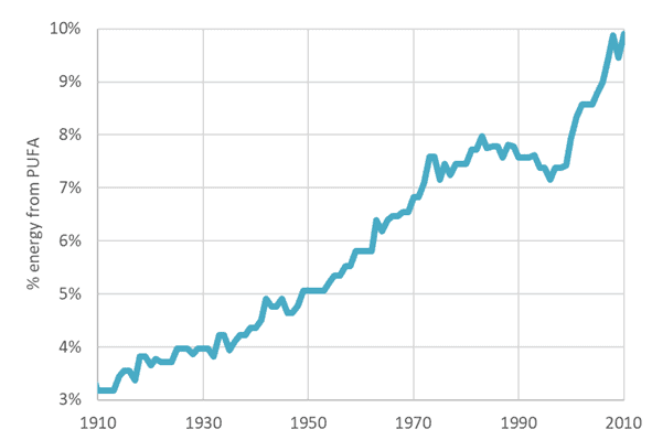 • In the last 200 years, despite overall fat consumption rising slightly, our intake of omega-3 polyunsaturated fatty-acids has decreased by an estimated 80%. That is quite a steep decrease that may match the data for cognitive decline.